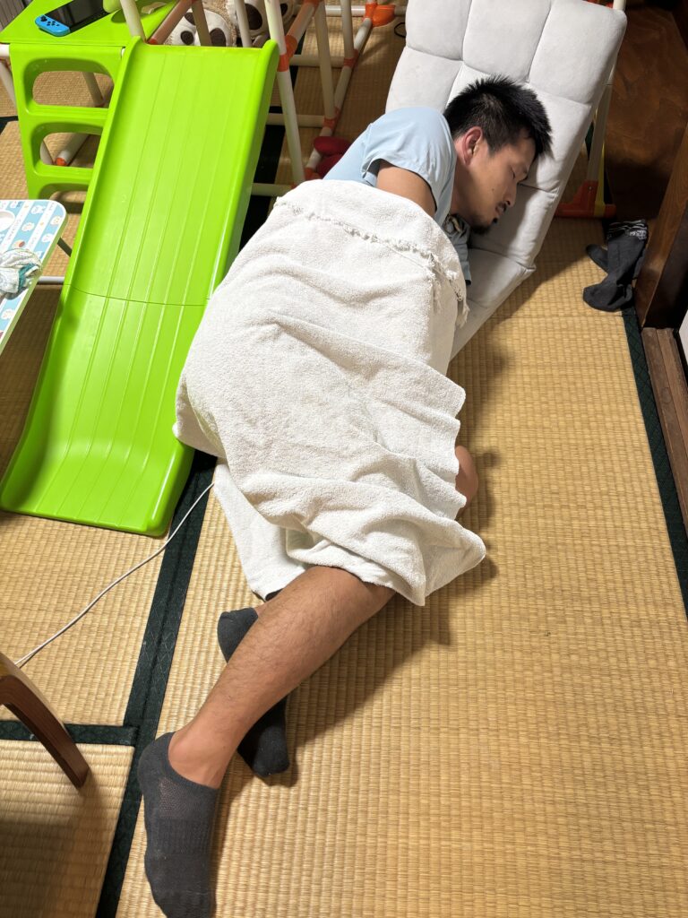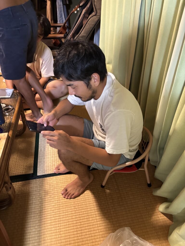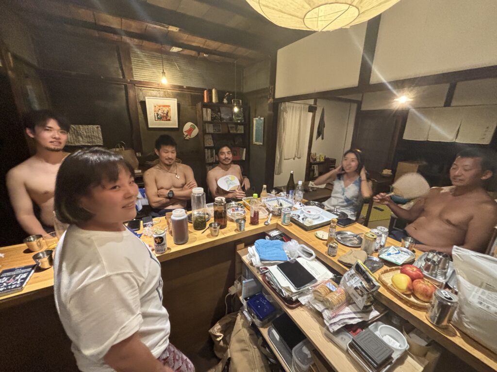 怒涛の三日間を終え、アツい古民家でユミちゃんを取り囲む上裸のおっさんども(我々)。