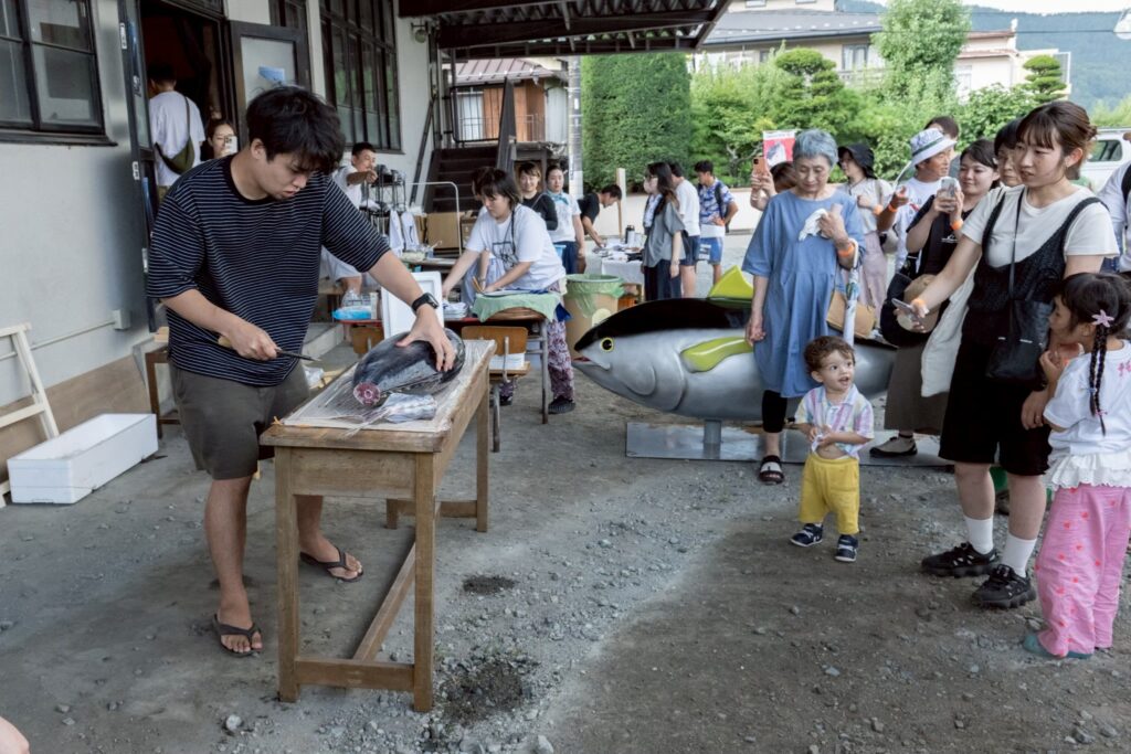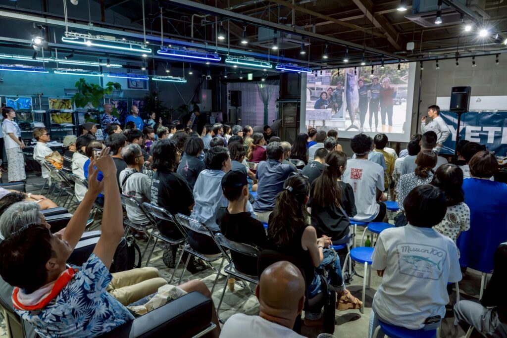 報告会後には、ユミちゃんがどこからか持ってきてくれた実物大のマグロの置物に見守られながら、これまたユミちゃんがどこからか手配してきてくれたマグロを(監督の室が)解体し、参加者の方と交流を深めました。マグロ美味い!